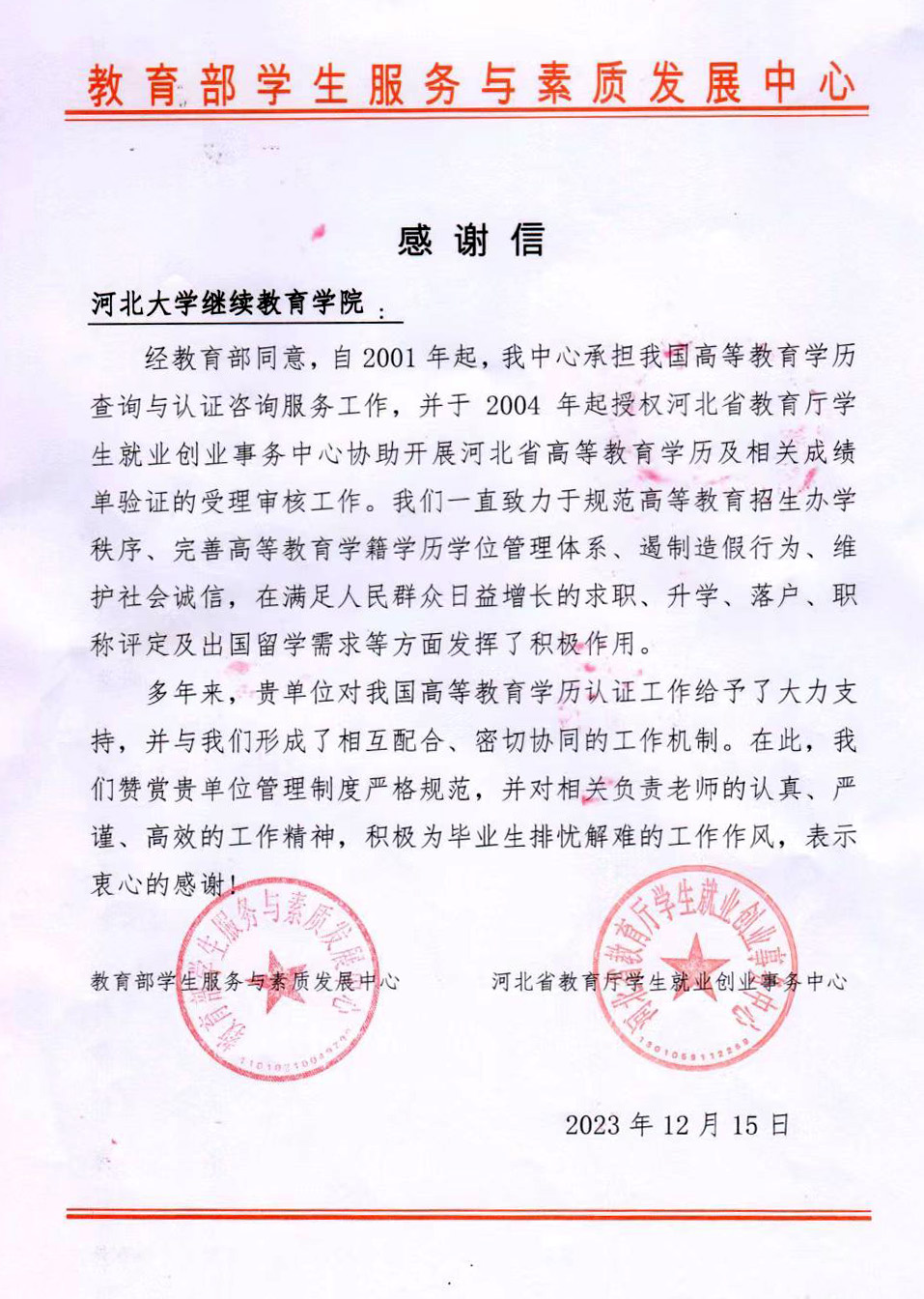 近日,教育部學生服務與素質發展中心、河北省教育廳學生就業創業事務中心向我校發來感謝信,對我校繼續教育學院多年來在高等教育學籍、學歷及成績認證等方面所做大量工作給予充分肯定。