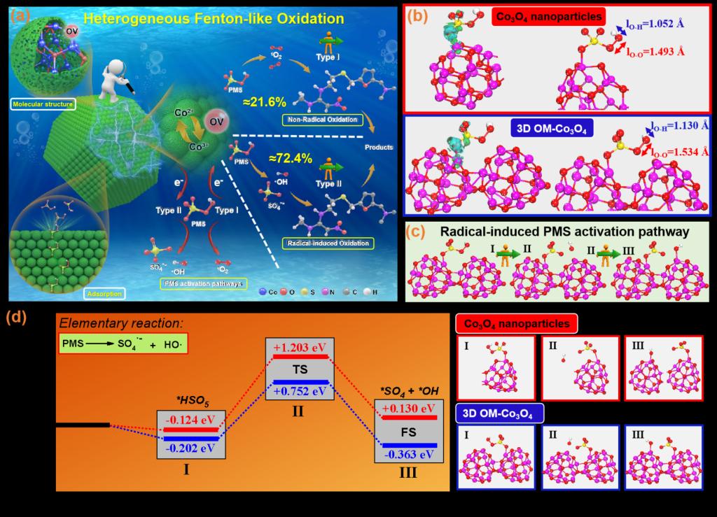近年來,藥品和個人護理用品(PPCPs)已對人類和野生動物的健康構成嚴重威脅,并在水體中被檢測到許多種PPCPs。非均相類-Fenton氧化技術由于具有操作簡單、效率高和不造成二次污染等優點成為了治理這類新型污染物的重要方法。本文中通過密度泛函(DFT)理論計算證實,有序排列的四氧化三鈷納米顆粒對目標污染物分子具有更強的吸附能和更低的活化能壘。電子順磁共振(EPR)技術也揭示這種結構調控手段可以實現體系中單線態氧的生成,更重要的是激發多重氧化作用機制共存于二甲胺類PPCPs的降解過程。